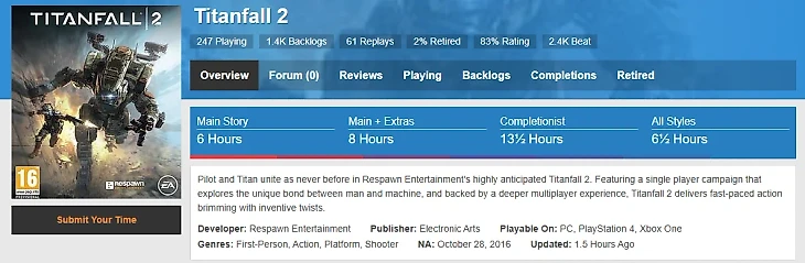 Игра номинировалась на игру года по версии The Game Awards в 2016 году, но проиграла мультиплеерному шутеру Overwatch. Что уж тут говорить, что игроки и критики тепло встретили игру. Поэтому, если вы вдруг упустили ее и ищете себе шутер на пару вечеров – Titanfall 2 один из лучших вариантов для этого. Игра проходится за 6 часов.