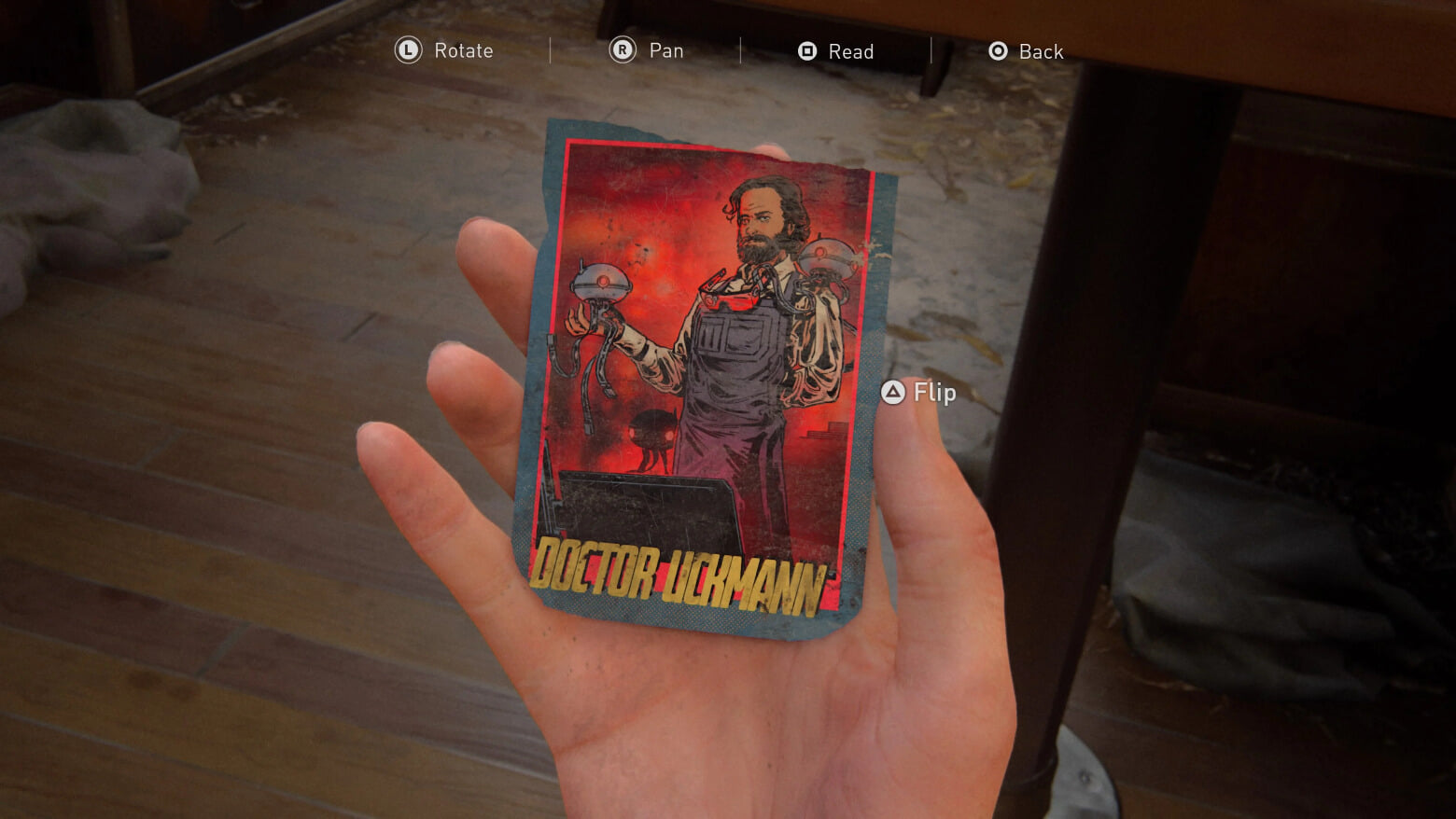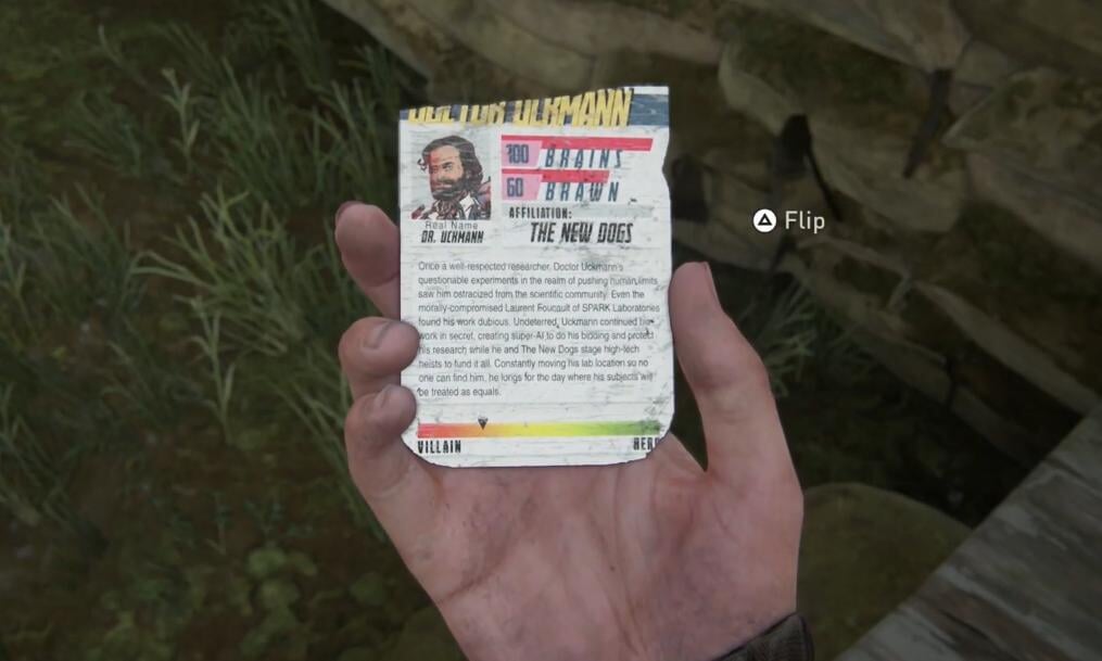 На протяжении всей The Last of Us 2 Элли собирает коллекционные карточки персонажей любимого комикса Savage Starlight. Неподалеку от музыкального магазина в центральном районе Сиэтла можно найти особенно любопытный экземпляр. Персонаж Доктор Акманн пишется как «Др. Акманн» и выглядит в точности как геймдиректор TLOU2 Нил Дракманн. Интересно, что на шкале морали Акманн ближе к злодеям, а в качестве его фракции указаны «Новые Псы» (The New Dogs) – явная отсылка к названию студии, Naughty Dog.