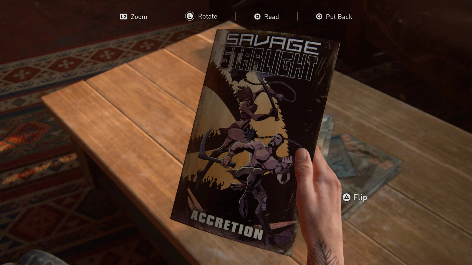 В главе «В поисках струн» на базе героев можно найти один из комиксов серии Savage Starlight – той самой, которой Элли одержима еще с подросткового возраста.