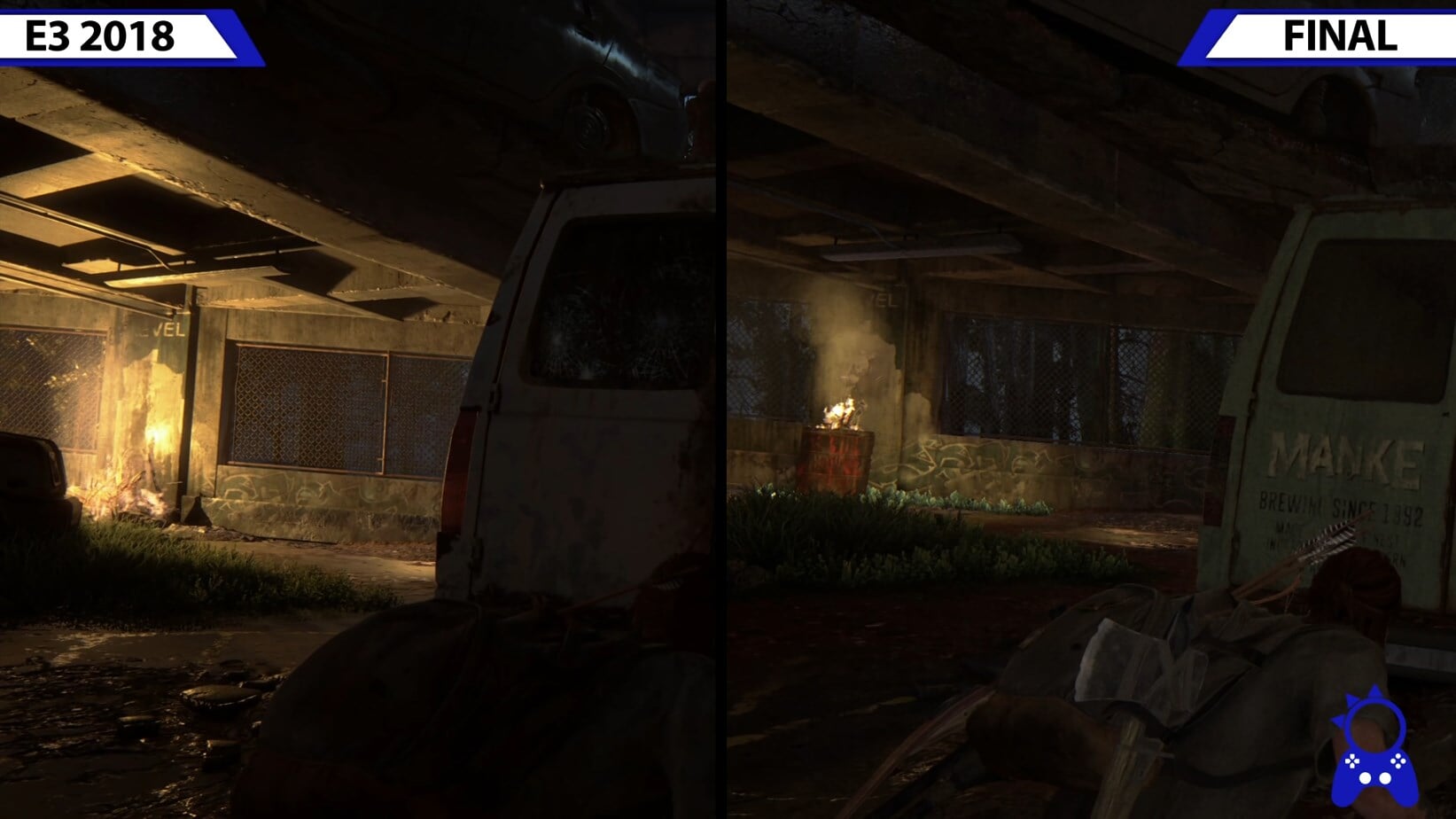 Финальной TLOU 2 не достает динамического освещения. Это касается как противников и Элли, которые теперь не отбрасывают четкие тени, так и локальных источников света. Судя по всему, в 2018-м году Naughty Dog показывала версию игры, где свето-тень просчитывается в реальном времени, в то время как финальная игра полагается на фиксированный свет. Такой подход менее требователен к железу, но занимает гораздо больше времени при разработке.