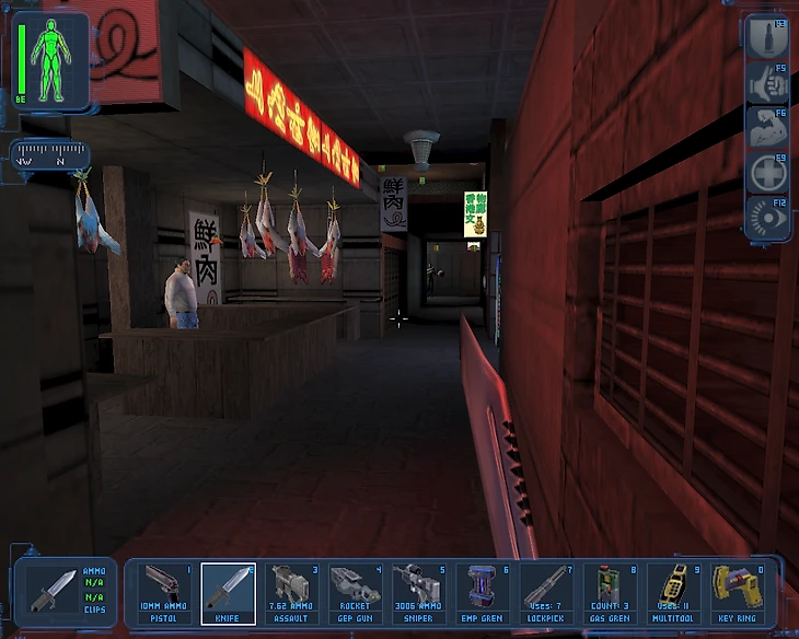 Плотность взаимодействия – еще одна сильная сторона Deus Ex. Уровни заполнены различными предметами, их можно толкать, тыкать, включать и залезать на них – все полностью функционально, от случайных деталей вроде туалетов со смывом, автоматов с газировкой и дверных звонков до сложных систем безопасности, которые можно взламывать для прохождения уровня. На видео ниже у игрока закончились отмычки, но такие мелочи в этой игре не останавливают – он просто взорвал дверь.