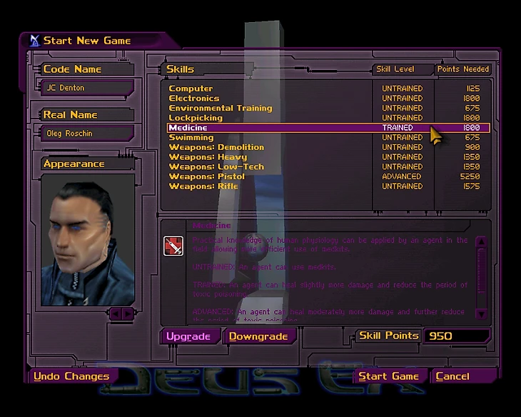 По ходу игры Дентона можно превратить в настоящего Терминатора – всего в игре 18 модификаций, и игрок выбирает именно те, что подходят под стиль прохождения. К примеру, для стелс-прохождения существует аугментация «Маскировка», делающая Дентона невидимым для людей и животных. При ее использовании звуки шагов все равно остаются, поэтому ее сочетают со способностью «Тихий бег». Благодаря правильному тюнингу персонажа каждое прохождение Deus Ex не похоже на предыдущее.