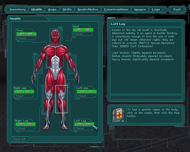 Привычной шкалы здоровья в игре нет, но аугментации изнашивались и повреждались. То есть, если вы повредили ногу, вам придется хромать, что замедляет передвижение. То же и с руками, а выстрел в голову становится летальным. У каждой части тела была своя шкала здоровья, так что с поврежденной рукой вы все еще могли пользоваться ногами и глазами как обычно.