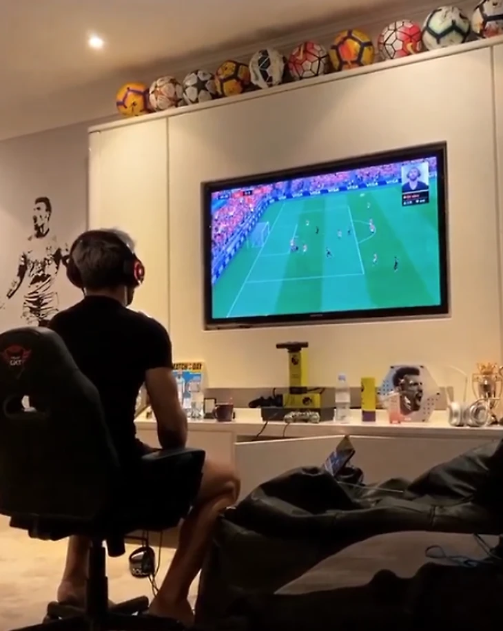 По бокам от кресла – карточки FIFA, игровой руль Porsche, мелкие награды, дюжина подписанных мячей на шкафу и фото с любимой.