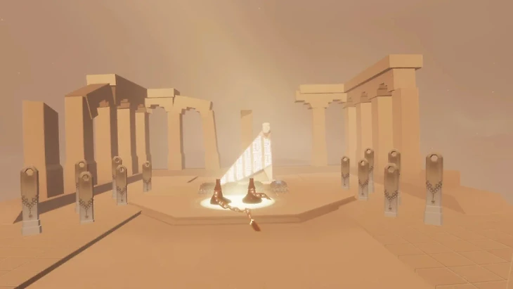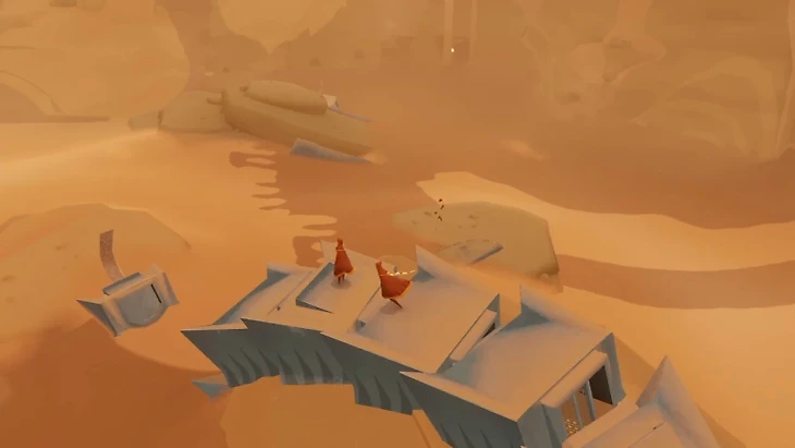 Мы начинаем игру сидя в пустыне. Главный герой – таинственная фигура в робе. Камера демонстрирует нам огромную гору вдали, что немного намекает на то, что это наша цель. Игра разделена на главы, с каждой новой главой мы все дальше отходим от пустыни и узнаем нечто новое о мире. Например, становится понятно, что мир до этого процветал. В нем были города и даже какие-то механизмы. В некоторых локациях мы видим какие-то емкости, в которых хранится ткань. Очевидно, она может быть использована как энергия. Сейчас же ее использует игрок, чтобы добраться до вершины. Так же видно, что пустыня – не самое страшное и запущенное место этого мира. Чем ближе к горе – тем страшнее путешествовать. Появляются единственные существа, населяющие этот мир – летающие механизмы, которые атакуют игрока, едва завидев.