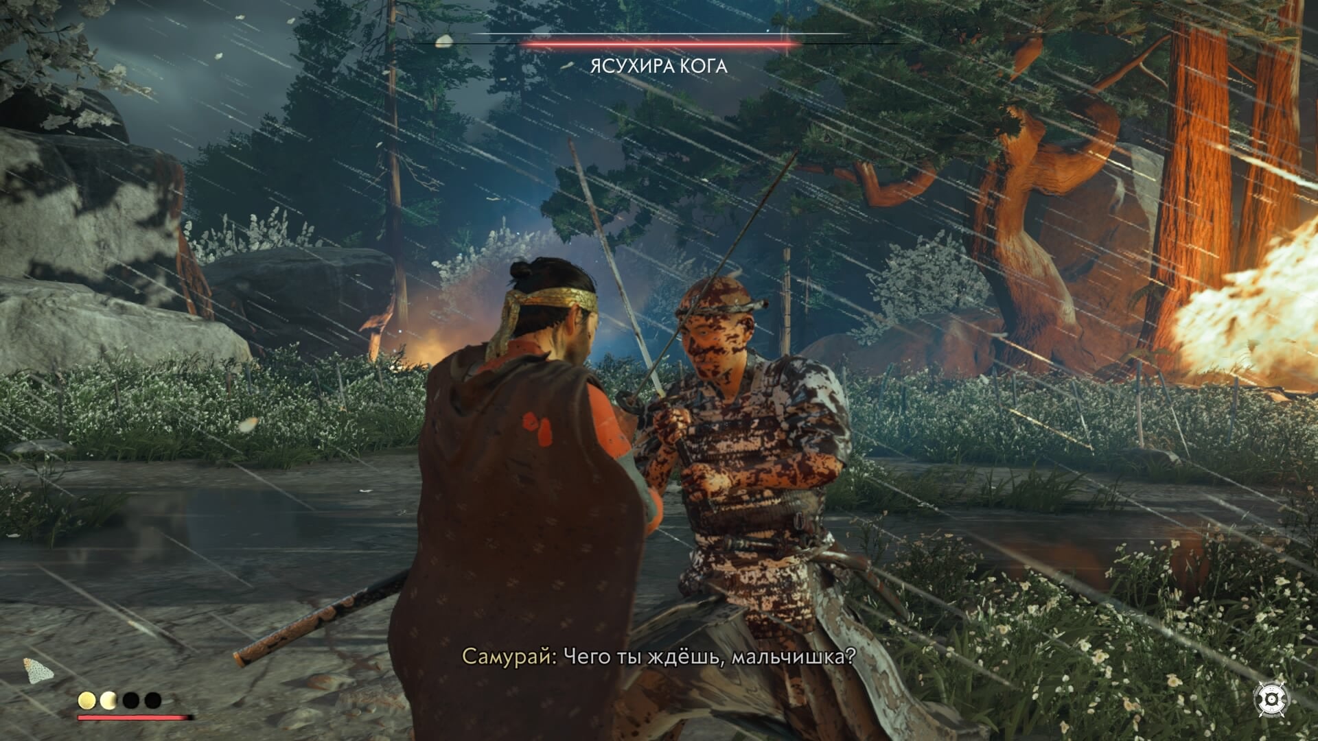 «Цусима» совсем не такая сложная, как может показаться. Я проходил игру на стандартной сложности (ее можно менять в любой момент) и, конечно, умирал, но только из-за серьезных ошибок или невнимательности. Дзина действительно могут зарубить за несколько ударов, но поначалу это лишь учит срезать численное превосходство противника перед самим боем, а позже только делает ощущения от битв острее. Здоровье в игре по умолчанию практически не восполняется: для лечения нужно нажать стрелку вниз и использовать одно очко решимости – так называется своеобразная энергия или мана персонажа, нужная для особо сильных атак. Решимость восполняется прямо во время боя при добивании врагов, или, например, после удачного парирования. То есть бездумно распоряжаться ресурсом не стоит, но и острой нехватки почти никогда не чувствуешь.