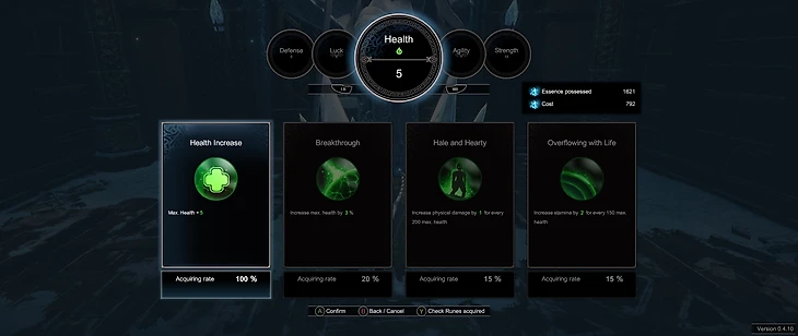 На мой взгляд, от rogue-like здесь даже больше, чем от соулсов. Прокачка эссенцией рандомна и спадает при гибели персонажа. Причём прокачка эта – то ещё казино. У каждого перка есть шанс, что вы его приобретёте. Если шанс не сработал, он увеличивается на 10 процентов, а вы получаете просто +1 к характеристике, которая привязана к перку. С каждым разом стоимость прокачки будет увеличиваться. То есть в начале пары тысяч эссенций хватит на десяток-другой попыток взятия перка, а вот после нужно придерживаться тактики, ибо удовольствие станет дорогим. Возьмете ли вы успешно перк или просто получите +1 к здоровью – стоимость всё равно повысится.