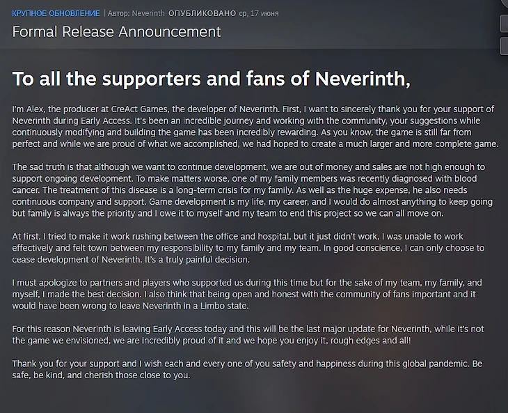 Как итог – игра ощущается как некое платное демо, которое вполне себе играбельно. Но продаётся она как полноценная игра. На странице игры в Steam нигде предупреждения нет. Поэтому советовать всем эту игру я никак не могу. Одно дело, если бы покупкой Neverinth можно было бы поддержать дальнейшую разработку – тут я бы сам ещё одну копию купил. Но нет, больше контента не будет. Появившиеся фанаты просят дать доступ к коду игры, но разработчики не появляются в сообществе.