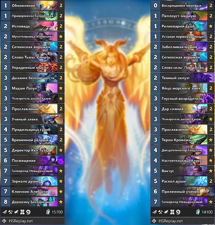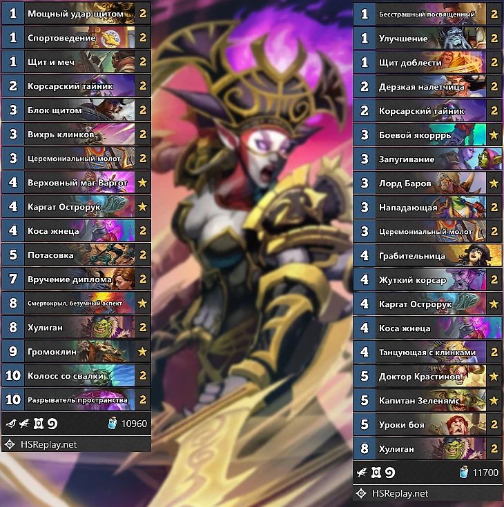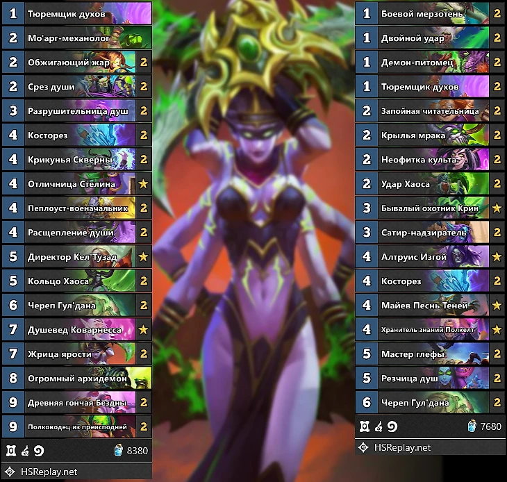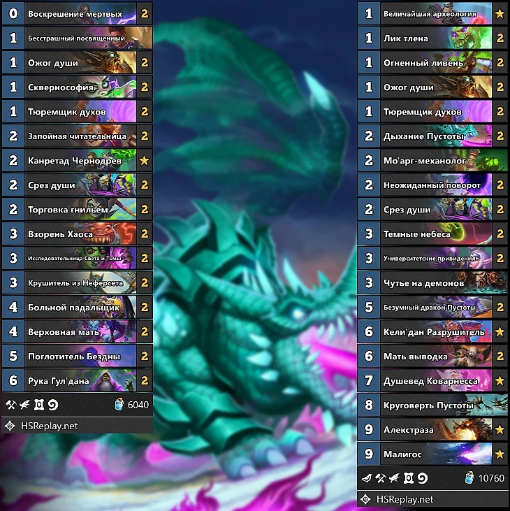 Против этой колоды невероятно скучно играть – она одинаково хороша и против агрессии, и против контроля из-за зачисток и комбинаций. В этой колоде лежат два больших дракона, которых нужно удешевить силой героя – хотя бы одного из них. Дальнейшее комбо с Малигосом вы знаете: Ожоги души, Дыхания Пустоты и остальной урон в лицо сопернику.