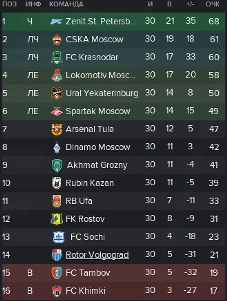 Удивляет падение «Ростова», хотя по меркам игры там выступают довольно посредственные футболисты. Кстати, главным тренером позвали Юрия Семина, но он ситуацию не спас. «Рубин» со Слуцким так и не совершил скачок. Зато Дмитрий Тарасов сыграл аж в 10 играх. «Сочи» возглавил Александр Тарханов, а «Динамо» – Игорь Колыванов. «Тамбов» и «Химки» ожидаемо рухнули в ФНЛ, «Ротор» спасся в стыках, выиграв у «Енисея» 4:3 в гостях и проиграв 2:3 дома.
