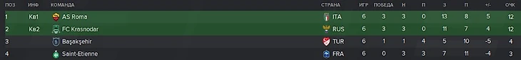 Вот мы и дошли до «Краснодара». В Лиге чемпионов опять не прошли отбор – отлетели от киевского «Динамо» (да, про невозможность играть вместе русским и украинским командам FM не знает). Зато в Лиге Европы получилось очень мощно. Для начала пройдена неслабая группа с «Ромой», «Сент-Этьеном» и «Истанбулом».