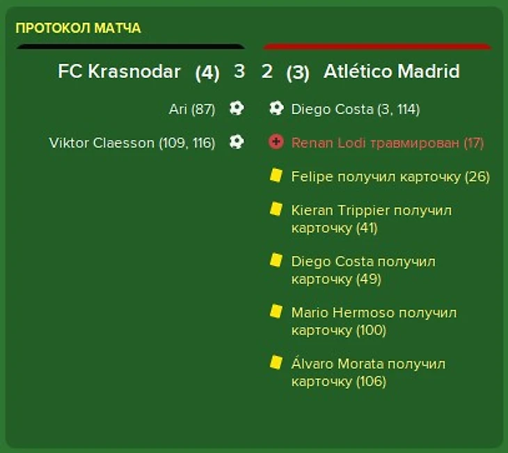 1:1 в гостях оставляли хорошие шансы, хотя Мадрид статистически был намного лучше. В Краснодаре Диего Коста уже на 3-й минуте открыл счет, но спас Ари, забив на 87-й. А дальше включился Классон – дубль в добавленное время и «Краснодар» в полуфинале.