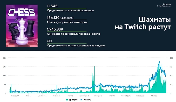 Стримы шахмат на Twitch мощно растут. На YouTube игру активно смотрят уже много лет, но на Twitch она редко набирала больше 3 тысяч зрителей. Однако в марте 2020 года спрос в категории Chess стал расти, сейчас средняя недельная аудитория – около 10 тысяч человек. Это не так много в сравнении с топовыми играми платформы вроде League of Legends и Fortnite, регулярно набирающими более 100 тысяч зрителей, но это значит, что в мае, например, пользователи смотрели шахматы более 8 миллионов часов.