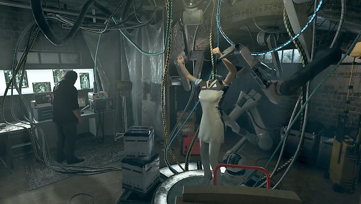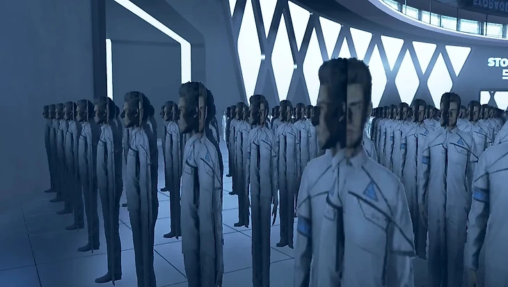 На фабрике андроидов нам показывают целую армию. У тех, что находятся близко к игроку, есть детали, но в местах, куда камера не доходит, их заменили плоскими фигурками, будто вырезанными для настольной игры.