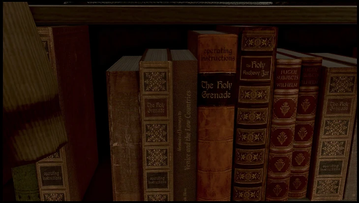 На нижней полке стоят книги, и на корешках можно прочитать их названия: например, The Holy Grenade – отсылка к святой ручной гранате из «Монти Пайтона».