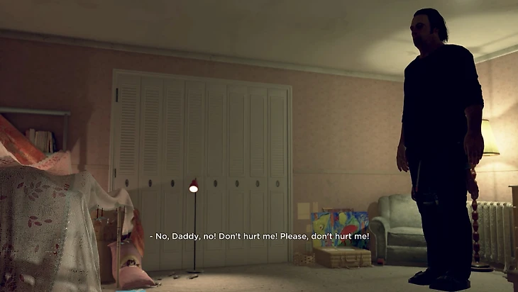 Когда мы вернемся в дом Тодда и выберем один «неправильный» вариант действий, Тодд с ремнем пойдет к Алисе наверх. Мы услышим жуткие крики ребенка, которого наказывают. Анимации избиения ребенка в игре нет – после того, как дверь закроется, владелец андроидов замрет в А-позе посреди комнаты.