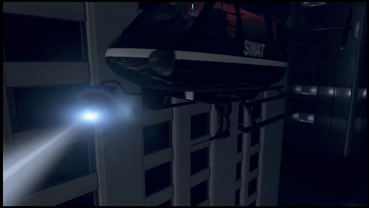 Если взглянуть на вертолет за пределами здания, можно увидеть как из него торчат ноги пилота. Выглядит крипово.