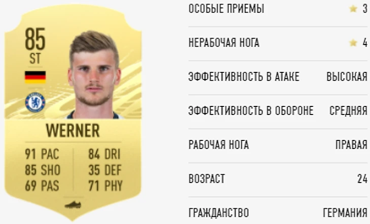 «Все по 85» – эта шутка долго не отлипнет от новых трансферов «Челси». Тимо получил буст на 2, но за 28 мячей в Бундеслиге и полуфинал ЛЧ с «Лейпцигом» (!), вероятно, имел право на большее. И, что забавно, получил: он имел рейтинг 86 после зимнего обновления. К сожалению, следуя какой-то своей логике EA не считает зимние апгрейды чем-то значимым и без труда понижает игроков, раззадоривая фанатов еще сильнее.