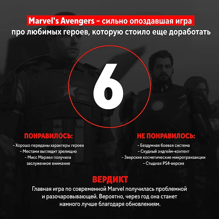Из-за ряда неприятностей Marvel’s Avengers вышла, когда о Мстителях и Marvel в целом впервые за десятилетие успели подзабыть, а реклама игры многим поднадоела. В этом смысле проект провалился еще до релиза: представьте, что в 2021-м выйдет большая RPG по «Игре престолов». Вроде бы идея возбуждает, но и поезд уже все-таки ушел.