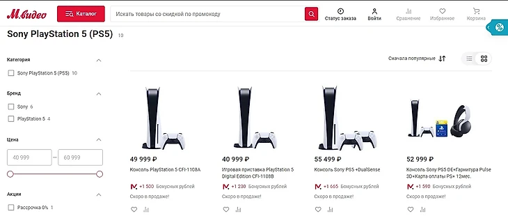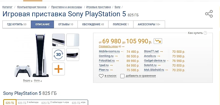 Купить Плейстейшн 5 можно у перекупщиков, стоимость консоли варьируется от 70 200 рублей до 105 990 рублей. Купить PS5 можно только по завышенным ценам.