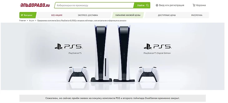 В Эльдорадо временно закрыт прием заказов на комплекты PS5 и геймпада DualSense. Поэтому и здесь приобрести желаемую консоль тоже пока нет возможности.