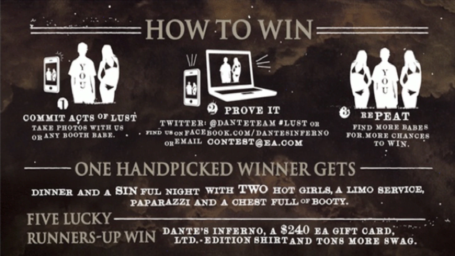Первым стал Luxuria. Грех похоти представили на Comic-Con 2009 в виде конкурса. Суть его заключалась в необходимости сфотографироваться с одной из девушек со стенда Electronic Arts. Затем пользователь выкладывал эти фото в твиттер или фейсбук с обязательными хештегами. После этого компания случайно выбирала победителя, которому полагались лимузин, сундук сокровищ и греховная ночь с двумя горячими девушками. Надо ли говорить, что жалоб на EA в твиттере было больше, чем фотографий.