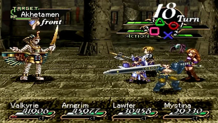 Это Valkyrie Profile. Игра выделяется не только тематикой, но и геймплеем. От других JRPG Valkyrie Profile отличает перемещение в виде, скорее, платформера, нежели стандартной японской рпг. Вне битвы мы управляем валькирией Леннет (главной героиней), которая бегает, прыгает, бьёт мечом для начала битвы и разгадывает головоломки. Кстати, в игре отсутствует гринд – враги не восстанавливаются вновь, как это бывает в других JRPG.