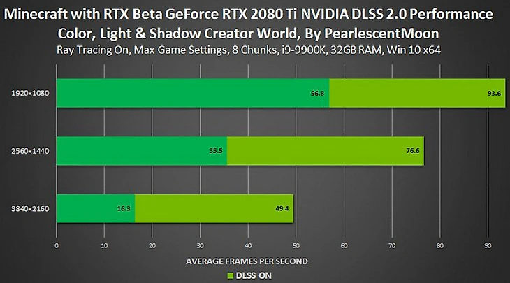 На картинке выше показано, как возрастает среднее количество кадров при включении DLSS 2.0 – это особенно заметно для разрешения Ultra HD. Именно эта технология позволяет видеокартам с поддержкой рейтрейсинга показывать неплохую производительность на максимальных настройках.