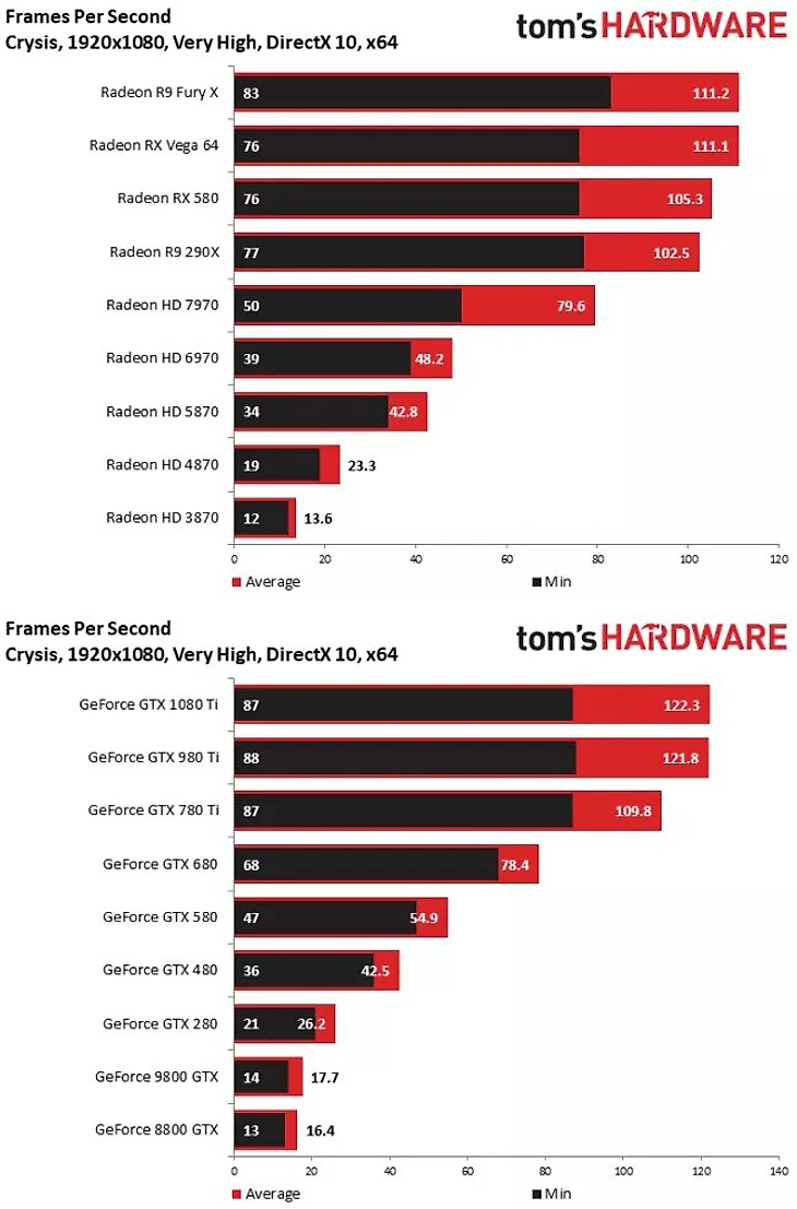 13 лет спустя, еще до выхода линейки RTX 20xx, с помощью Crysis все еще проверяли современные видеокарты. В разрешении 1080p на высоких настройках было около сотни кадров в секунду на топовых видеокартах, а на Radeon HD 3870 и 8800 GTX Crysis был почти неиграбельным. А флагманские карты тех времен Radeon RX R9 Fury X и 1080 Ti были примерно в 7,5 раз мощнее флагманских видеокарт 2007-го.