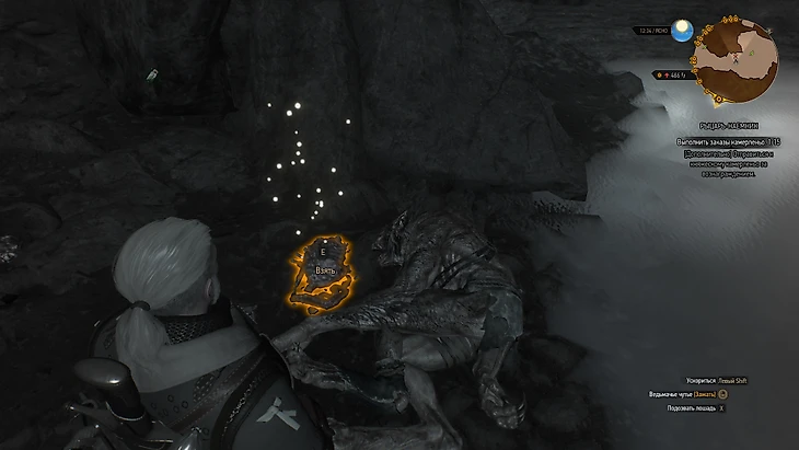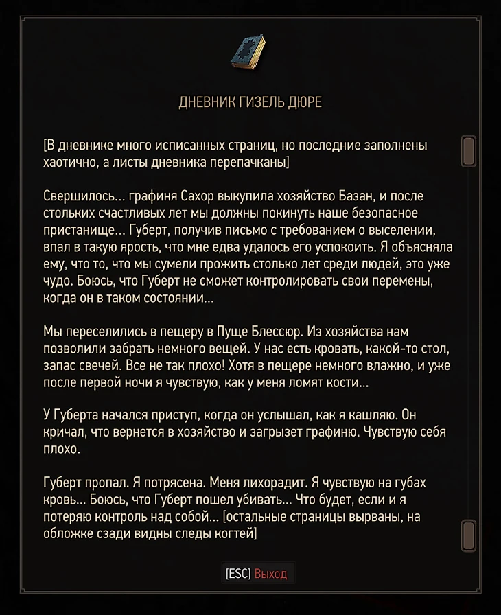 В глубине пещеры обустроено жилое место с постелями, а также там лежит дневник Гизель – именно ее ведьмак убил пару минут назад. В нем взволнованная девушка расписывает, что Губерт не контролировал себя и, когда услышал ее кашель, впал в ярость и пошел убивать графиню.