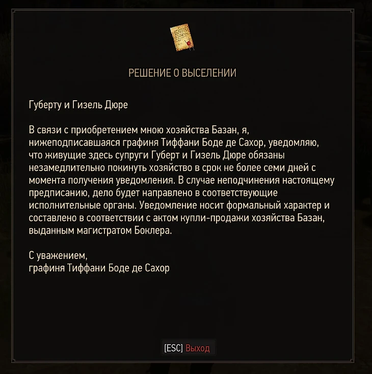 По заданию княжеского камерленьо Геральт убивает чудовище и находит на его теле записку. Новая хозяйка этих земель графиня Тиффани выселила супругов Дюре (хотя в английской версии Гизель – мужчина, и, возможно, приходится Губерту братом).