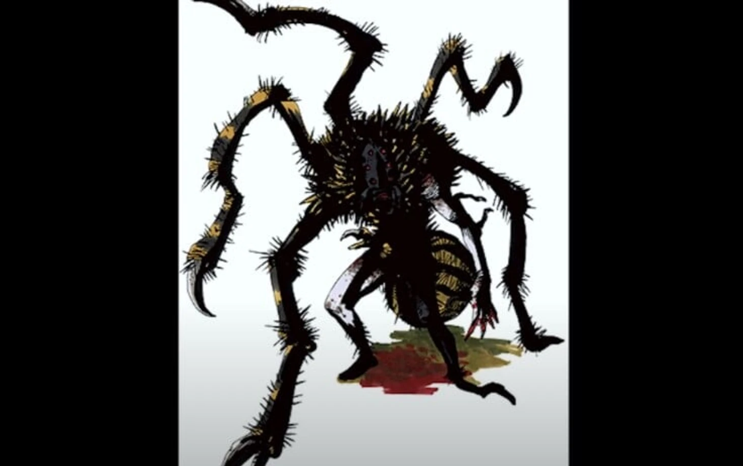 Теперь он выглядит как жуткая смесь человека и паука. Человеческое лицо, с пустыми темными глазами, и мохнатое туловище паука.