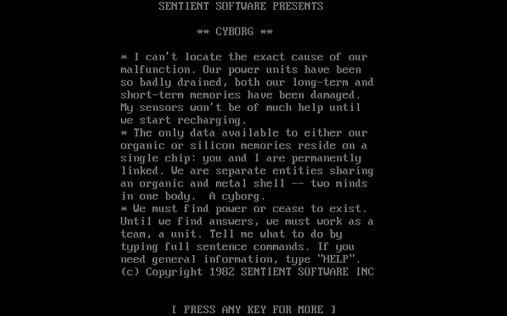 Это текстовая адвенчура, в которой игрок пишет действие, а игра реагирует и продвигает его дальше. Успеха Cyborg не увидела, но вдохновила для создателей Shadowrun и Syndicate.