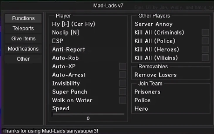 В режиме Mad City читеры могут включать опцию анти-репорта (честные игроки не могут зарепортить абузера), Noclip (прохождение через стены, двери и другие препятствия) и ускорения скорости бега персонажа.