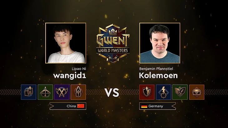 В первой партии wangid1, играющий на синей монетке, взял Скеллиге, а kolemoen – колоду Скоя'таэлей. Немец выигрывает затяжной первый раунд и играет второй, несмотря на малое количество карт в колоде и высокий риск потерять карту. Wangid1 не добивается преимущества, а в третьем раунде kolemoen получает легендарную руку. Итог предрешен. (0:1)