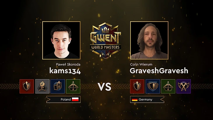 В первой партии Нильфгаард kams134 встретился с колодой Чудовищ на Кельтуллисе и Альзуре от GraveshGravesh. Колода польского игрока использует стратегию на «тактике» с Толстой Хельгой, бомбардирующей стол соперника. Kams134 легко выигрывает первый раунд и отдает второй. В третьем раунде Gravesh пытается разыграть Кельтуллиса, но у него ничего не выходит. (1:0)