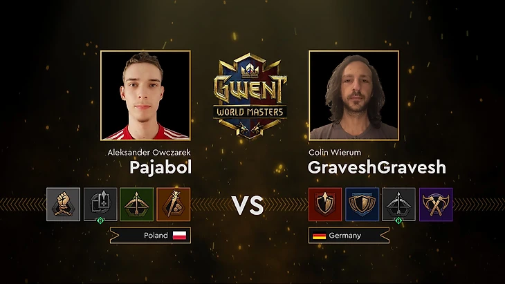 Первую партию дня игроки начали на колодах Нильфгаарда и Чудовищ. Долгий первый раунд заканчивается потерей Pajabol способности лидера. В третьем раунде поляк не находит Бал-маскарад и должен был проиграть, но странная игра Gravesh подарила ему второй шанс. Ничья.