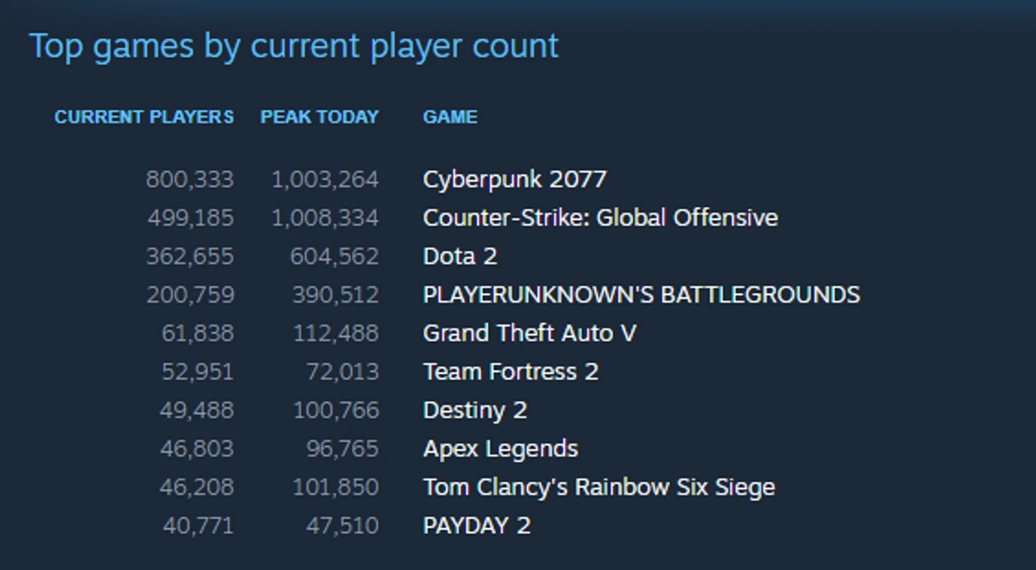 Прошлый рекорд среди синглплеерных игр принадлежал Fallout 4 – 472 962 игроков одновременно. Для сравнения, пик онлайна в PUBG составил 3,2 млн игроков, что является абсолютным рекордом Steam. Но сейчас даже мультиплеерные проекты не выдерживают конкуренции – в день релиза Cyberpunk разница онлайна с Counter-Strike: Global Offensive была всего в пару тысяч пользователей.