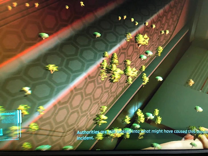• Джейсон Шрайер (журналист и автор книги «Кровь, пот и пиксели») нашел необычный глюк. Найт-Сити в его версии игры наполнен какими-то маленькими деревьями.