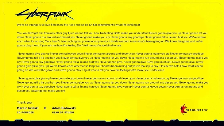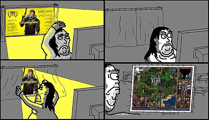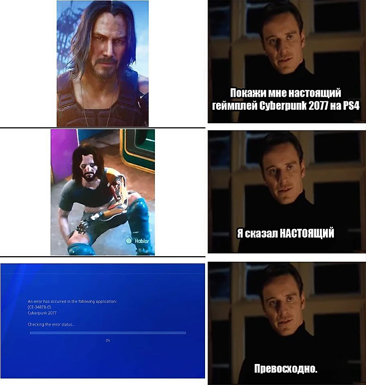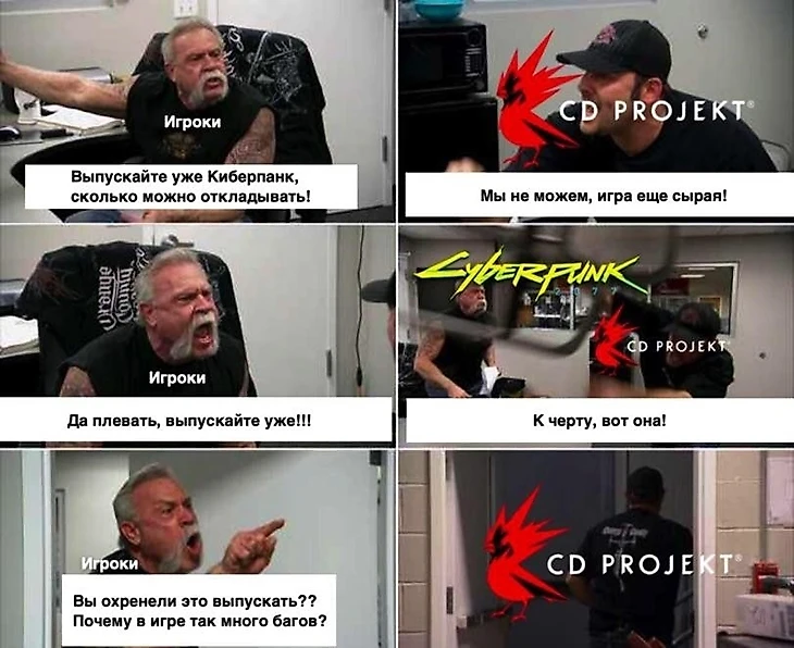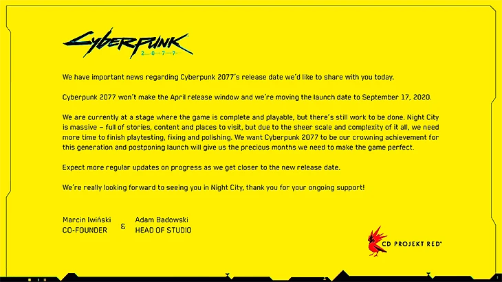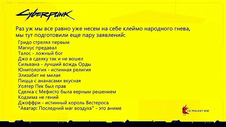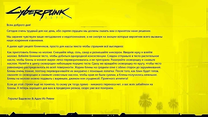 Самым первым мемом по Киберпанку стала желтая картинка с сообщением о переносе игры.