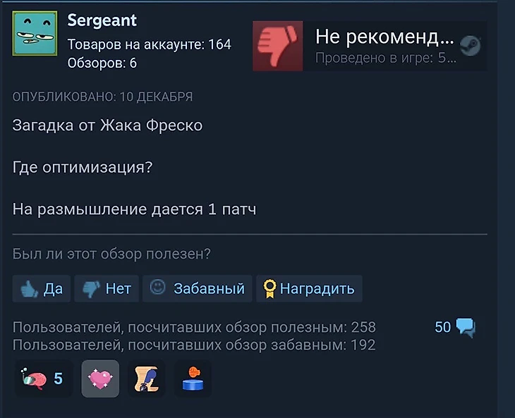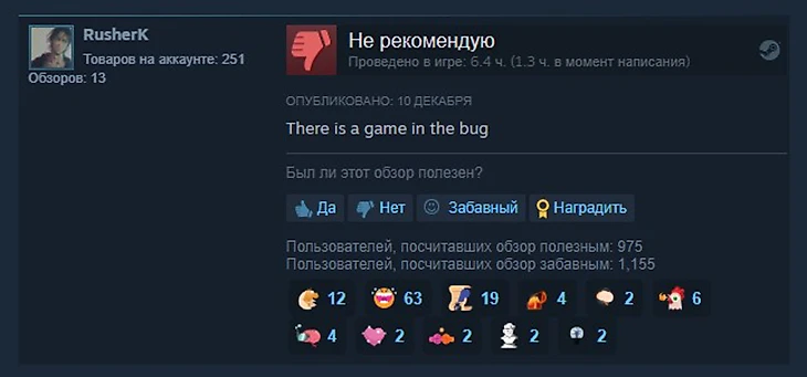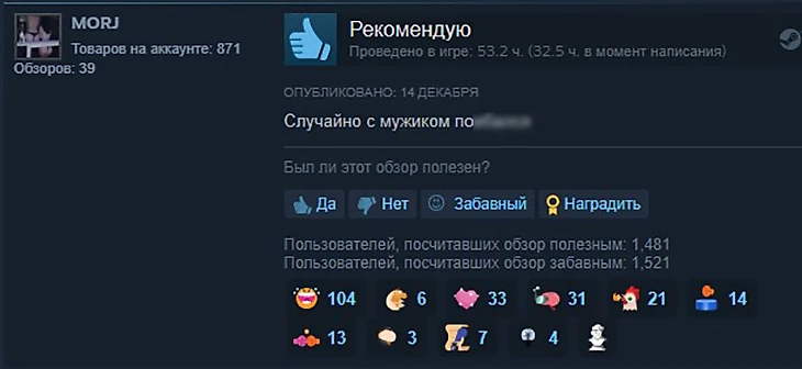 Рецензии игроков в Steam также пестрят юмором. Игроки «оценили» оптимизацию и случайные секс-сцены: