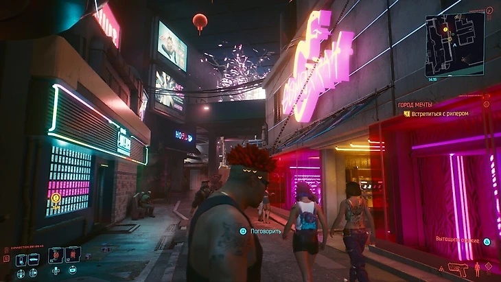 Здесь же ничего такого нет и близко. Встречные люди не имеют даже намека на личность – это просто моделька, либо приклеенная к одной точке, либо бесцельно слоняющаяся по тротуарам. Даже редкие встречные, реагирующие на Ви, вываливаются из своей односложной роли при взаимодействии: если «Поговорить» с девушкой из «Шельм» на входе в «Лиззи», она может предложить протагонисту «отсосать сиськи», хотя секунду назад сделала ему комплимент. Абсолютно бесполезные реплики невпопад сильно вредят погружению – лучше бы с обычными NPC просто нельзя было взаимодействовать.