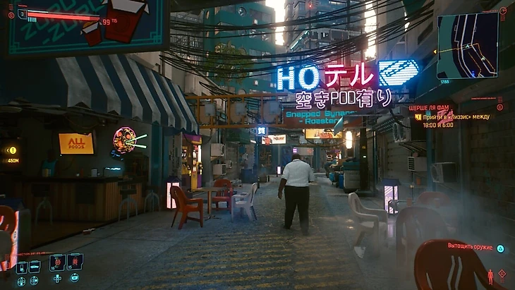 Команда, конечно, постаралась, чтобы создать один из самых визуально впечатляющих и детализированных виртуальных городов, а вот на проработку взаимодействий с ним, видимо, времени совсем не осталось. Здесь нельзя сесть за столик в баре (если только вы не пришли туда пообщаться с крестовым NPC), сходить в качалку, затариться в секс-шопе или сделать что-нибудь еще. А какая боль ждет человека, который обнаружит, что в игре совсем нельзя менять внешность героя! Ну да, ну да: значит, пойти к рипердоку и поменять руку на техническую я могу, а вот сменить прическу или даже макияж Ви – нет, никогда. Что за чушь?
