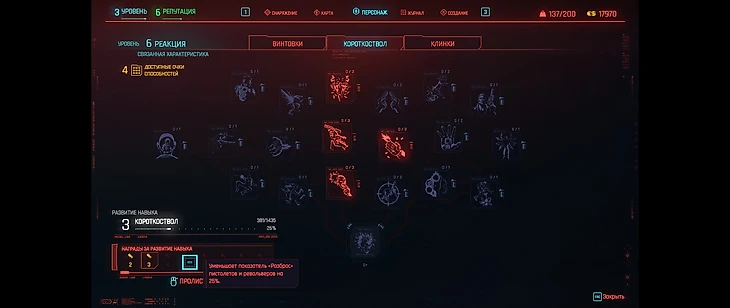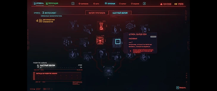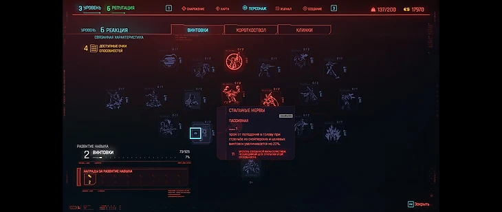 Прокачка в Cyberpunk 2077 своеобразна – вы получаете очки опыта за различные действия. Например, убивая по стэлсу, вы будете получать общие очки опыта, но у вас будут прокачиватся награды за развитие навыка «Скрытность», убивая из пистолета вы получаете награды за развитие «Короткоствола» и т.д. Получаемые очки способностей не привязаны к навыку – вы можете внезапно вложить их в крафт или ближний бой, даже если не качаете его.