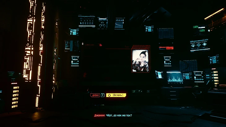 Садитесь на диван и включайте огромный телик – там покажут слайд-шоу из фото разработчиков. Джонни сядет рядом и сыграет мелодию.