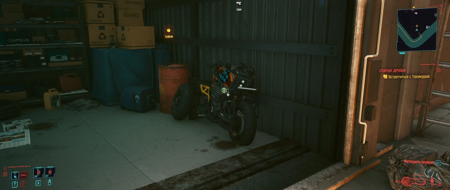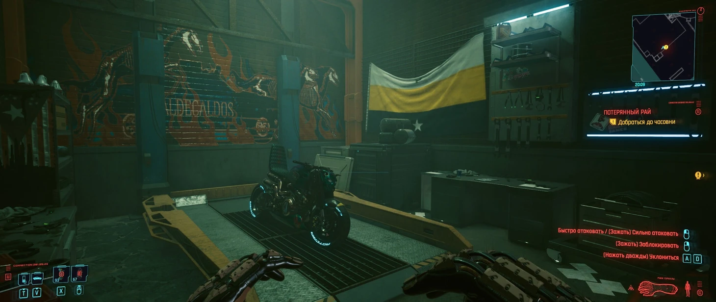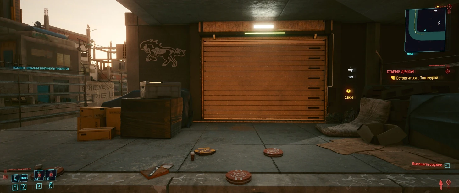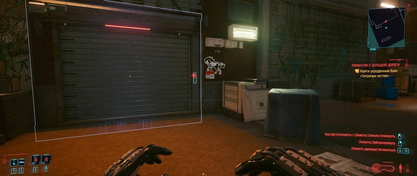 Осматривая район Санто-Доминго в локации ранчо Коронадо, я наткнулся на дверь с интересным символом (сначала мне показалось, что это единорог – отсылка к «Ведьмаку»). Дверь открылась, а внутри нашелся байк, с которым можно взаимодействовать – Джонни Сильверхенд сразу говорит, что его уже не восстановить.