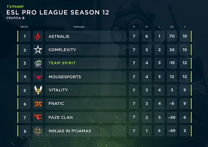 Весь сентябрь наш состав играл в рамках ESL Pro League Season 12 в европейском дивизионе. Среди соперников, с которыми нам довелось встретиться, — Fnatic, Vitality, compLexity, NiP, FaZe, mouz и Astralis.
