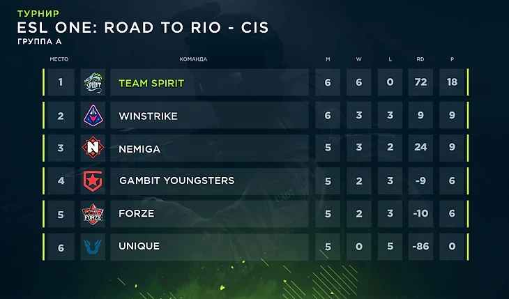 Соперниками стали сильнейшие команды СНГ-региона, однако и наши ребята превосходно показали себя. В групповом этапе ESL One: Road to Rio мы одержали победу в пяти матчах из пяти, забрав 10 карт из 11 сыгранных, обыграв таким образом Gambit, forZe, Unique, Nemiga и Winstrike.