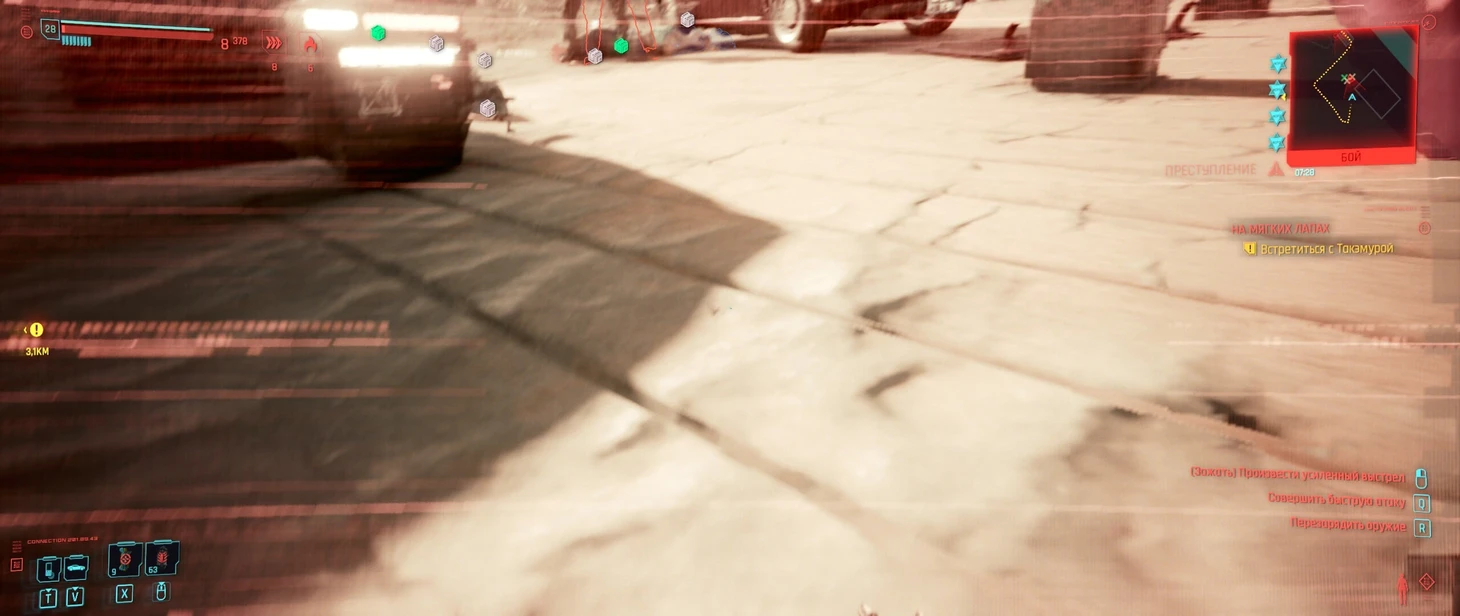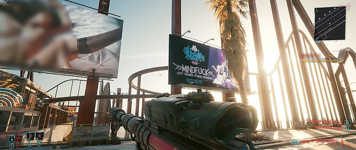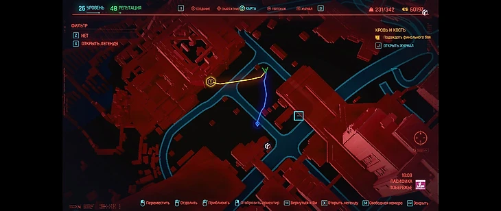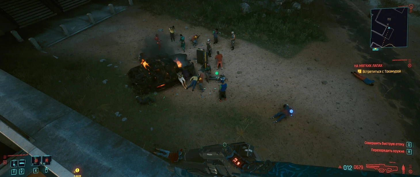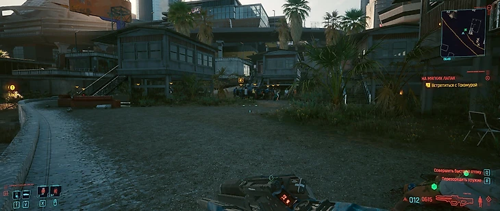 Как видите, здесь много бандитов и присутствуют гражданские – если заденете их, то придется иметь дело с усиленными «мусорщиками», которые здесь вместо полиции. Они уступают по урону полицейским из Найт-Сити, но все еще крайне опасны, в особенности нетраннеры. Их взлом способен снести свыше 500 здоровья за пару секунд – сложно успеть прожать лечение. При хорошей броне и стойкости к негативным эффектам выжить будет проще, но в любом случае сначала рекомендую избавиться от них.