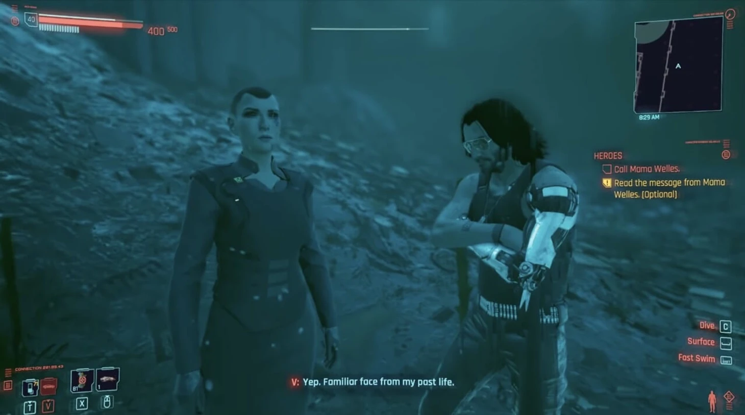Если вы обнаружите ее уже после того как в голове Ви поселится Джонни Сильверхенд, то протагонист прокомментирует увиденное: «Милитех» не прощает, «Милитех» не забывает». После этого Ви обменяется парой реплик с Джонни:
